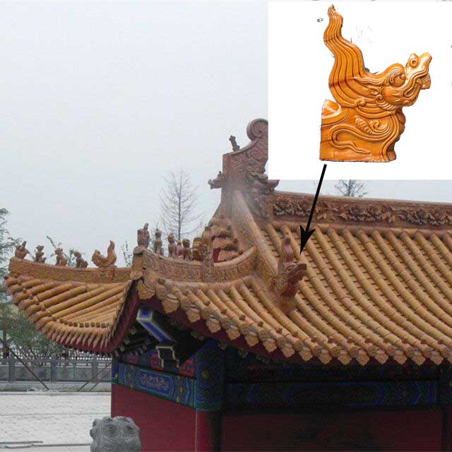 : 垂獸又稱角獸,是漢族古建筑上垂脊上的獸件,是獸頭形狀,位于蹲獸之后,內(nèi)有鐵釘,作用是防止垂脊上的瓦件下滑,加固屋脊相交位置的結(jié)合部。